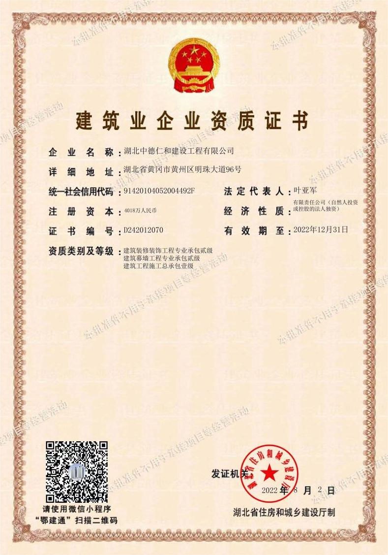 8月2日,經湖北省住房和城鄉建設廳核準,湖北中德仁和建設工程有限公司升級為建筑工程施工總承包一級資質。資質的成功晉升,將極大地提升中德仁和公司的核心競爭力,推動企業綜合實力躍上新的臺階,為企業未來的長遠發展奠定堅實的基礎。