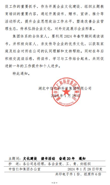 (集團辦訊) 經湖北省新聞出版局核準,由湖北中信仁和科技集團有限公司編印企業文化書籍的《中信仁和集團--奮進20年》,于2024年1月28日正式出版,現已向社會相關方面贈閱,并作為春節文化大餐,分發體系企業員工集中閱讀學習。