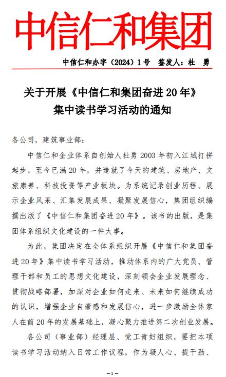 中信仁和集團《奮進20年》出版 集團體系同步開展集中讀書學習活動
