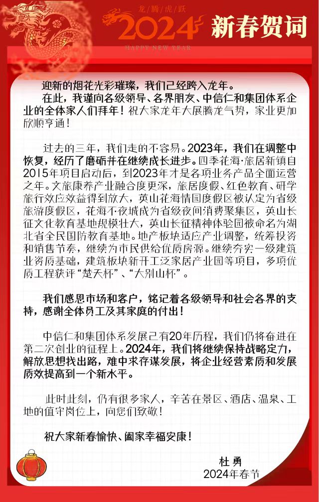 2024年農(nóng)歷正月初一零點前夕,董事長杜勇發(fā)出新春賀詞。全文如下: