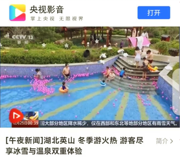 12月25日00:38,央視《午夜新聞》播放《湖北英山:冬季游火熱 游客盡享冰雪與溫泉雙重體驗(yàn)》,花樂湯為英山溫泉的兩大場景之一。