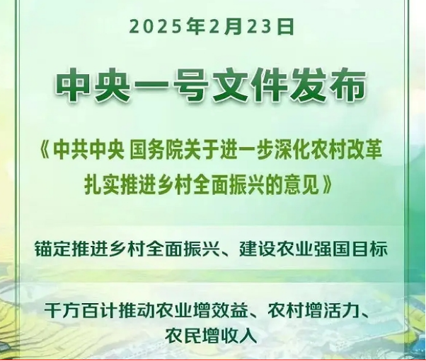 2月23日,2025年中央一號(hào)文件《中共中央國務(wù)院關(guān)于進(jìn)一步深化農(nóng)村改革扎實(shí)推進(jìn)鄉(xiāng)村全面振興的意見》重磅發(fā)布。