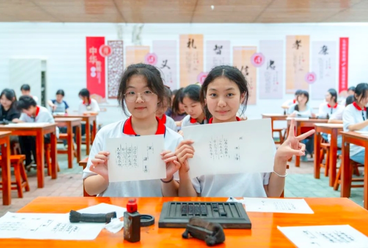 第二批次各組的同學們從南門進入景區,他們的研學之旅則從體驗豐富多彩的游樂項目和文化活動開始。滑草場上,同學們感受著風馳電掣般的刺激;打靶項目中,大家凝神專注,鍛煉著耐心和信心;在體驗畢昇活字印刷術時,同學們穿上漢服,行拜師禮,親手操作活字排版印刷,在實踐中領略到了中華傳統文化的博大精深。隨后,他們也踏上了長征縮微路,追尋革命先輩的足跡。