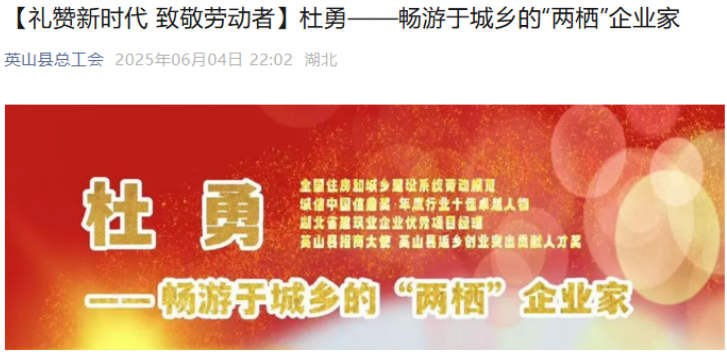 6月4日,“英山縣總工會”官方微信號刊發“禮贊新時代 致敬勞動者”專版,以圖片形式鮮明提煉了全國住房和城鄉建設系統勞動模范、中信仁和集團董事長、湖北四季花海旅游發展有限公司董事長杜勇的勞模品質亮點。