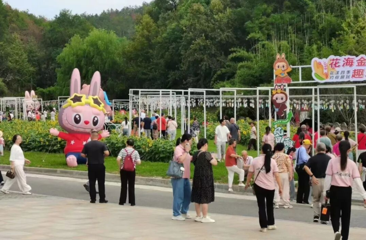 景區特別布置了'國慶主題'花藝造型,五星紅旗與鮮花相映成趣,吸引眾多游客駐足拍照。花海中的'氣模打卡點'人氣爆棚,成為最熱門的拍照勝地。